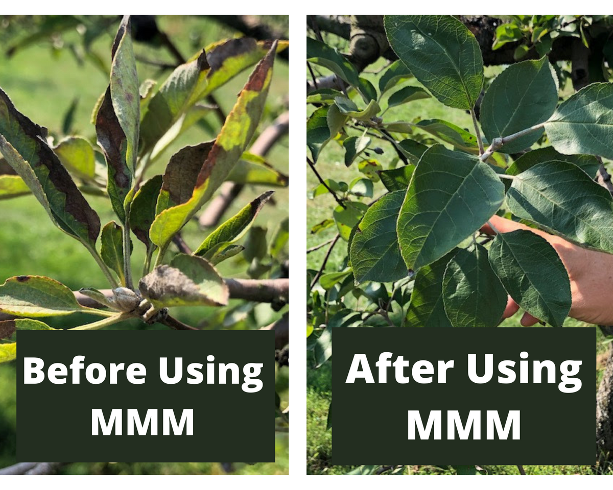 Three years ago, Mike discovered that some of the older, original apple trees in the orchard were facing difficulties. Recognizing an opportunity, he collaborated with an agronomist to develop 'Mike's Mighty Micros', a well-balanced blend of essential nutrients for plants. The image on the left shows a 35-year-old apple tree that was on the brink of death. Following three years of spraying the concentrated solution mixed with distilled water on the leaves, the tree exhibited a remarkable improvement in health. The leaves appeared larger and healthier than they had in years. Witnessing this transformation, Mike was inspired to make this natural super concentrate accessible to all, enabling everyone to cultivate larger, sturdier, and more nourished plants.